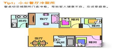餐桌切忌被廁所門直沖。餐桌是家人進食的口福之處,而廁所是“出穢”的不潔之地,彼此直對當然不吉,容易“病從口入”,導致家人健康不良,所以應該要避免。
