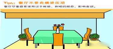 餐桌上方宜平忌壓。若上方屋頂傾斜不平或橫梁壓頂,或位于樓梯底下,均會對家人健康有損,必須設法避免. 橫梁成煞,幾乎略懂風水的人都知道。但橫梁所壓者不同,便有不同的影響,如飯桌上方有橫梁,便做成橫梁壓飯桌了。這會妨礙人的消化能力,久而久之,便招致腸胃病了。