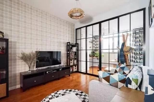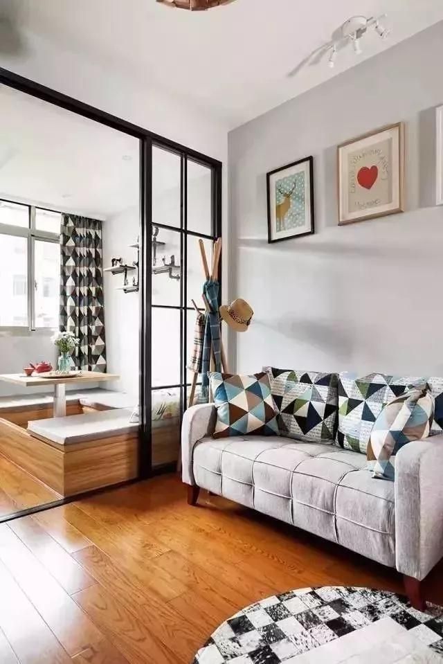 客廳面積小,沒(méi)有搭配茶幾,只擺放了兩人位沙發(fā)以及鋪了一塊地毯,簡(jiǎn)潔有范兒。