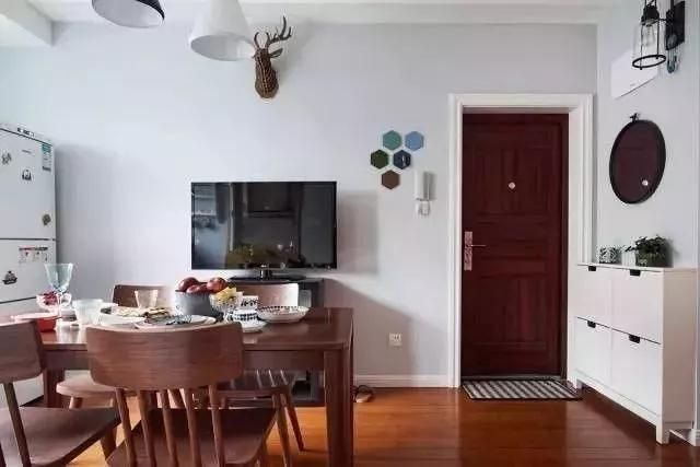 選用原木色的餐桌椅,自然又溫馨,同時(shí)還配有一臺(tái)電視機(jī),可以邊吃飯邊看電視了。