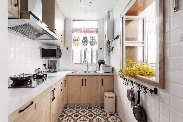 從廚房通往客廳的過(guò)道,以統(tǒng)一的棕、白、綠三色花紋地磚鋪面,與客廳的實(shí)木地板形成明顯對(duì)比,這也是干濕分區(qū)。