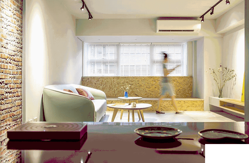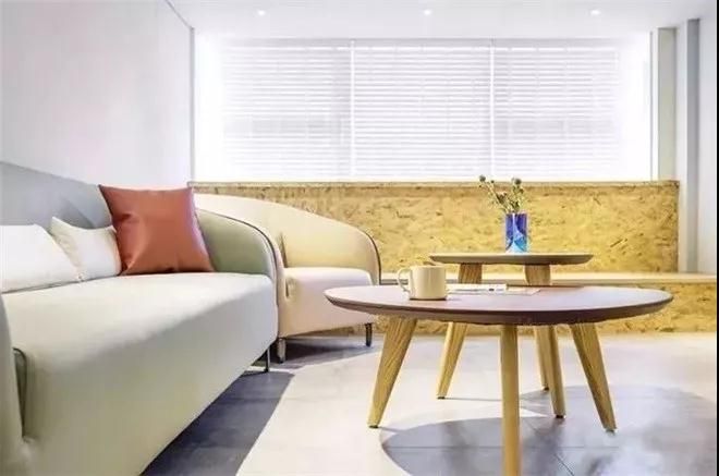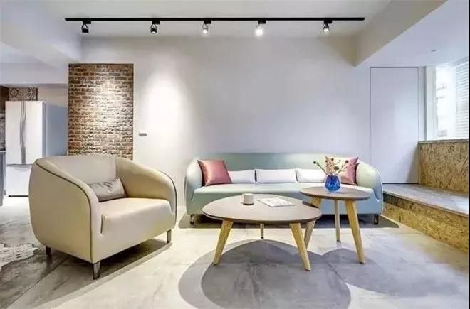 空間設(shè)計相當簡潔,大白墻,低飽和色系沙發(fā),有種軟糯的感覺,適合小女生。