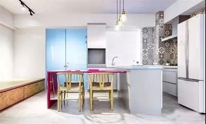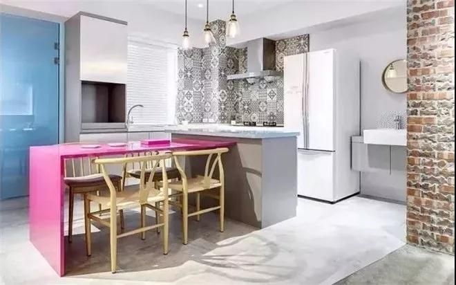 玫紅色水晶板中島餐桌,與料理臺呈T型連接,在用餐的同時也能很好的與家人朋友互動,一個色調(diào)活潑,功能實用的餐廳。
