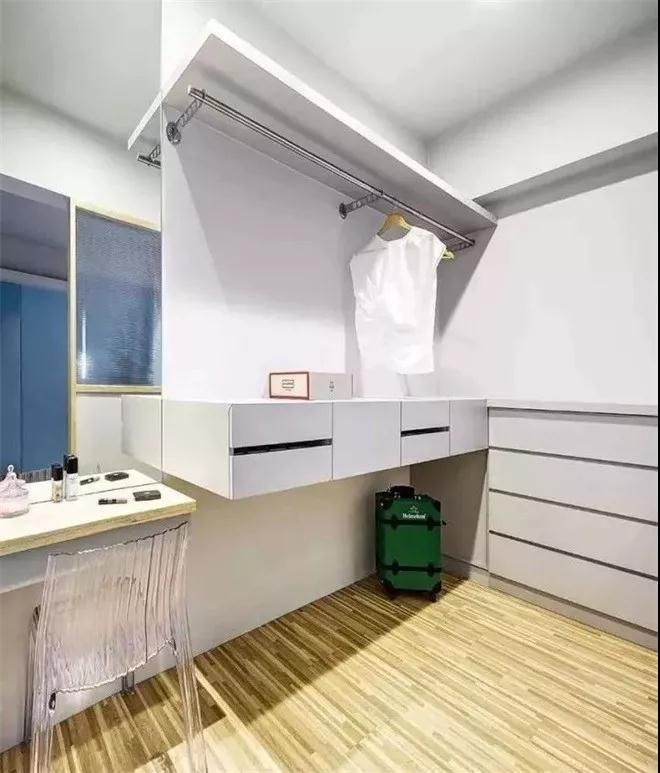 這是臥室的另一個房間,說是臥室,其實更應(yīng)該稱這里為休閑區(qū),主要突出功能性和舒適性,左面全為柜體式墻面,打開里面空間容量大,輕松解決空間收納問題。