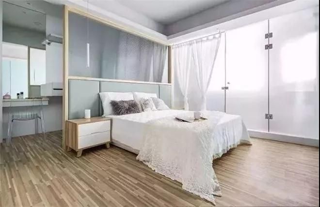 主臥整體以淺湖綠與純白為基調(diào),局部加入木色堆疊出輕柔的氛圍,采用壓花玻璃床頭半作隔斷設(shè)計出一處衣帽間,再用毛玻璃設(shè)計功能隔間,營造視線通透的舒眠環(huán)境。