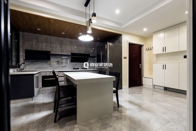 開放式餐廚設計,讓原本入戶變得十分大氣,爵士白的臺面與原木材質的吊頂相得益彰,時尚與愜意兼具。